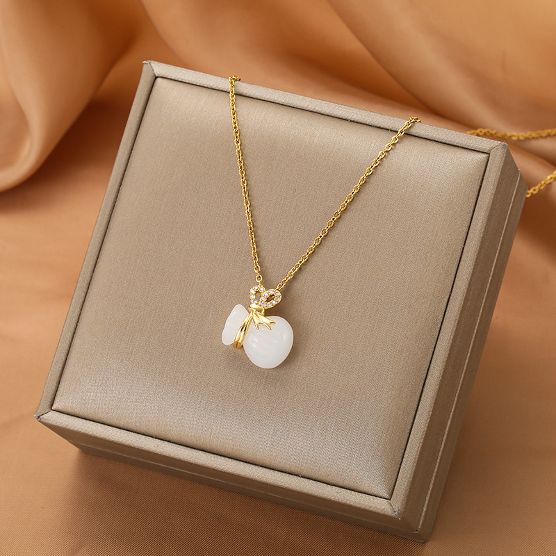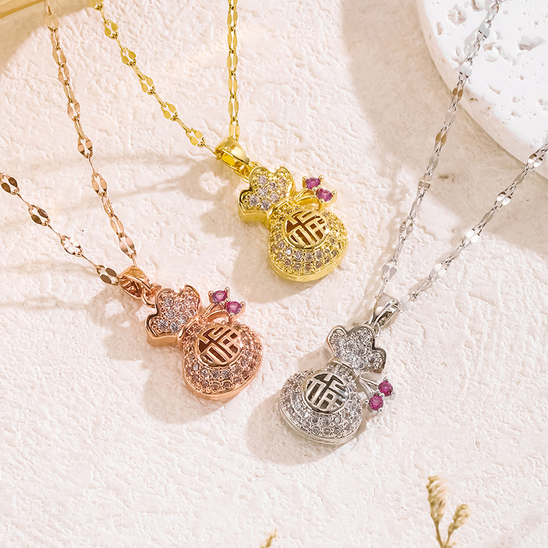 チタン鋼の福のブランドのネックレスの女性の中国風の軽い豪華な気質のヒョウタンのお金の袋は財の鎖の鎖のネットの赤い福の字の項飾りを吸います。