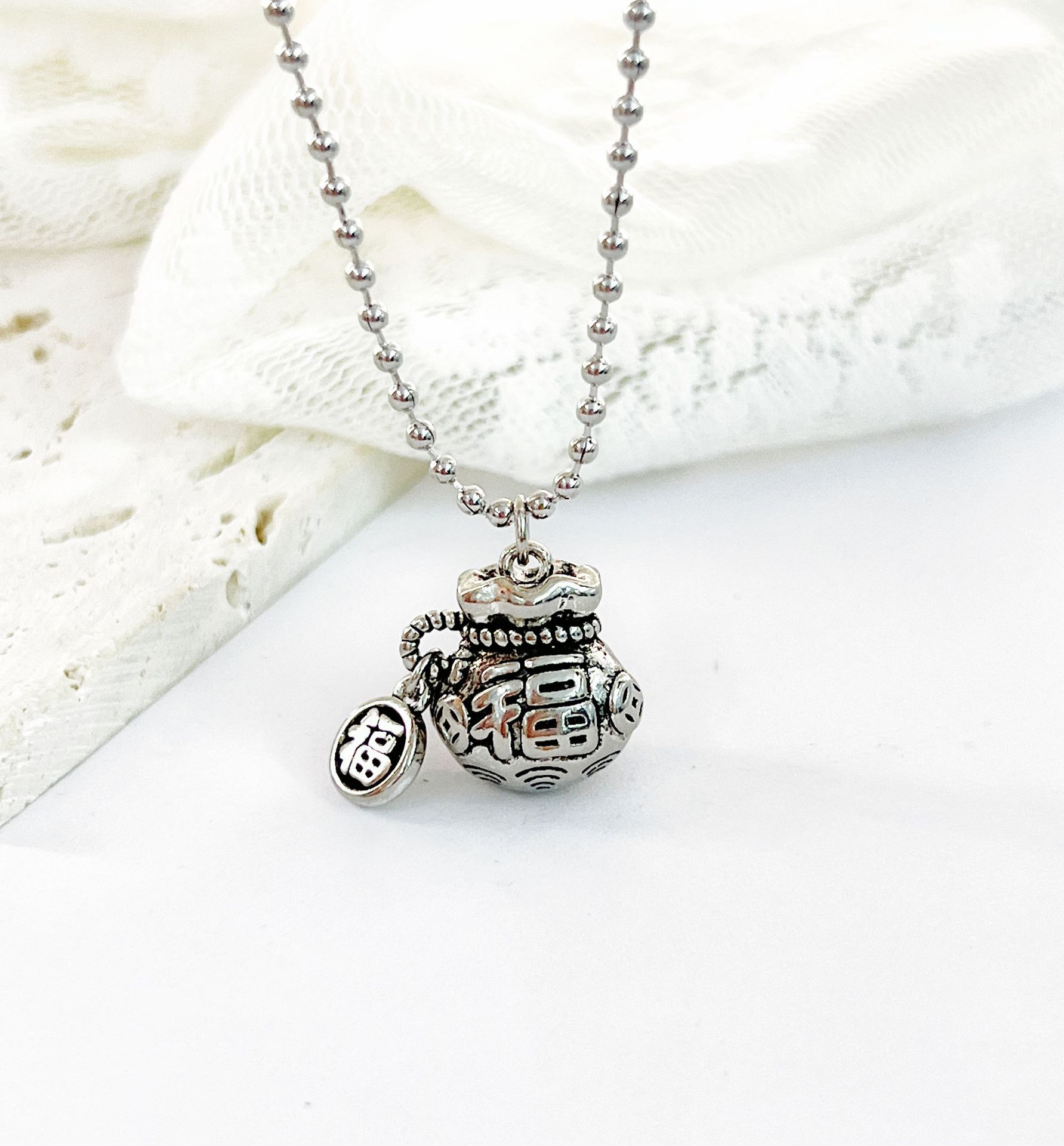 福の字の吉祥の中国風はわずかにドリルのネックレスの女性のチタンの鋼の透かしを詰めてお金の小さいお金の袋を募集します。