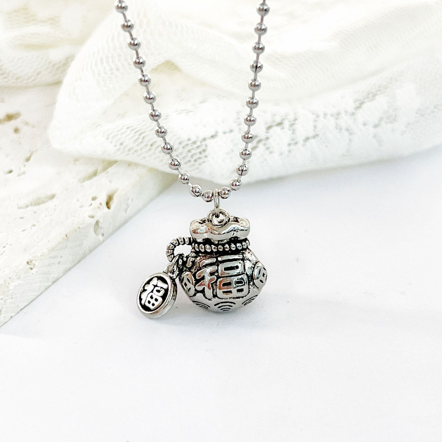 足銀999レトロ旧百福招財サイズ福袋銭袋女性ファッションセーターチェーン銀項ペンダント