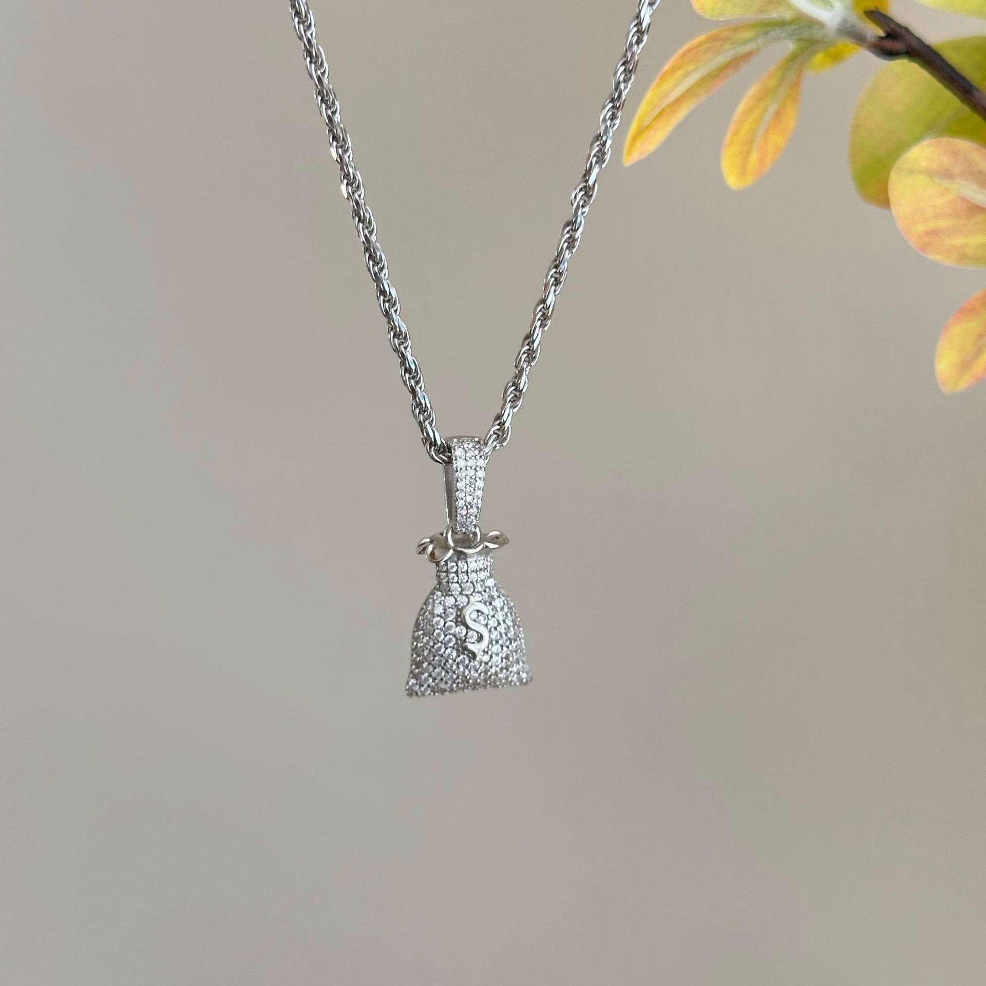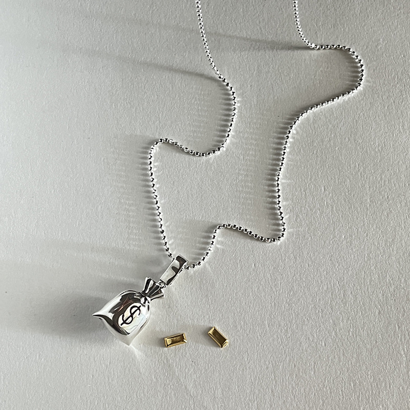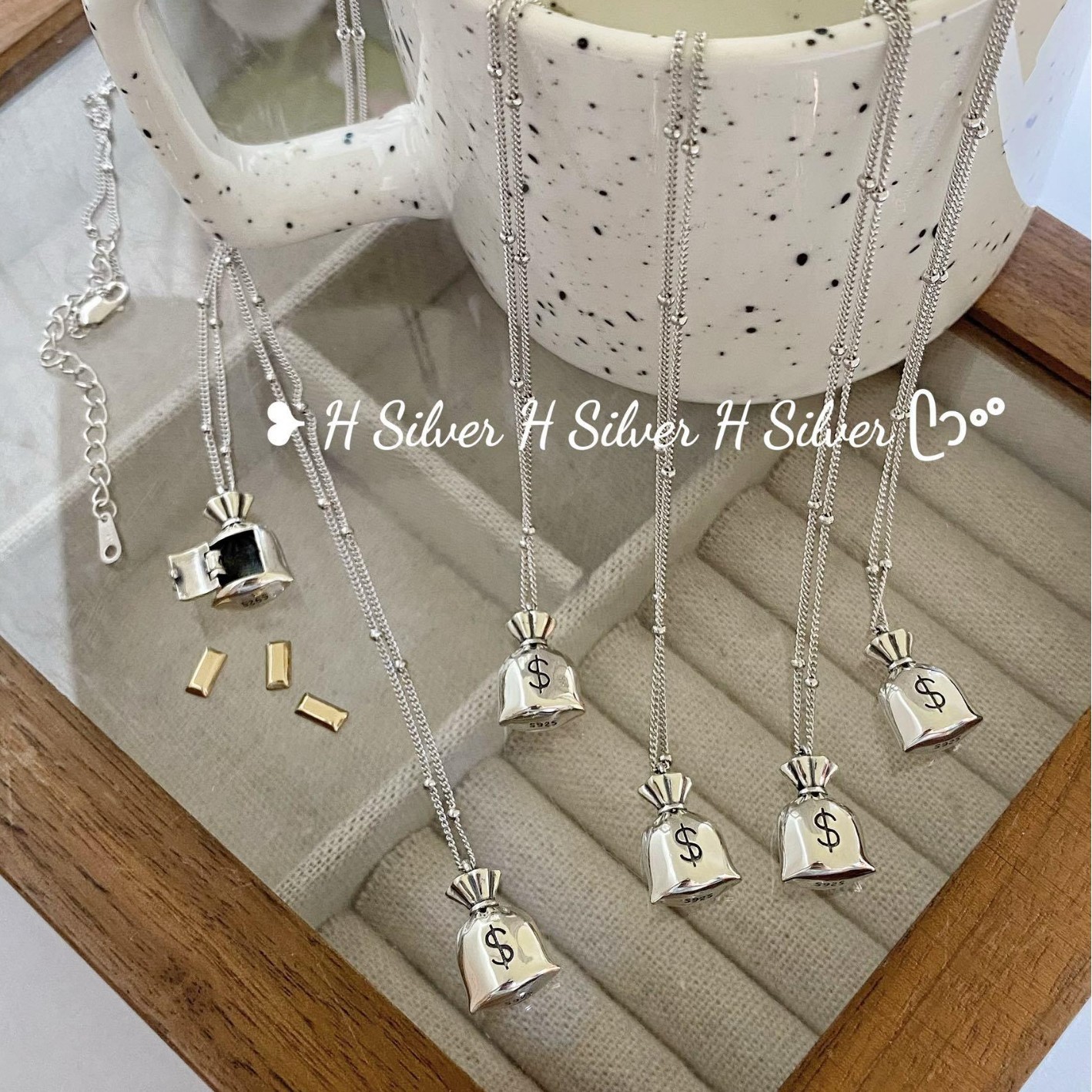 925純銀は金を持っています。銀のお金の袋のネックレスがあります。