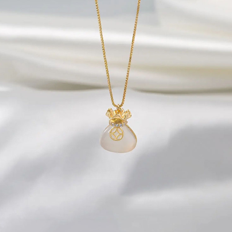 S925純銀白玉髄福袋ネックレス女銭袋玉ペンダント