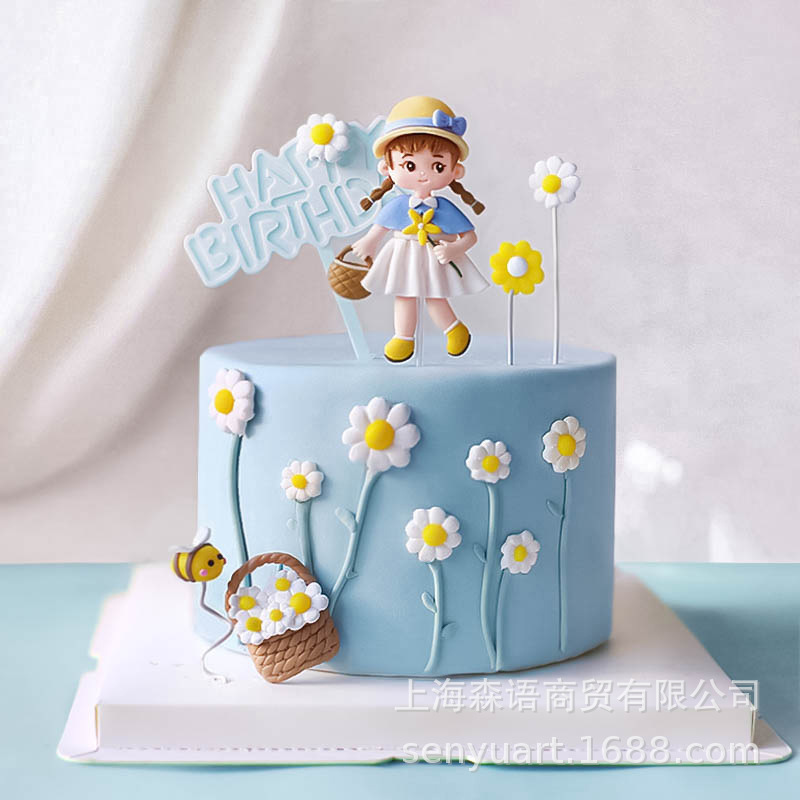 ベーキングケーキ装飾ブルーフレッシュな少女白いスカート黄色の帽子デイジー花海ハイキングシーン誕生日プラグイン