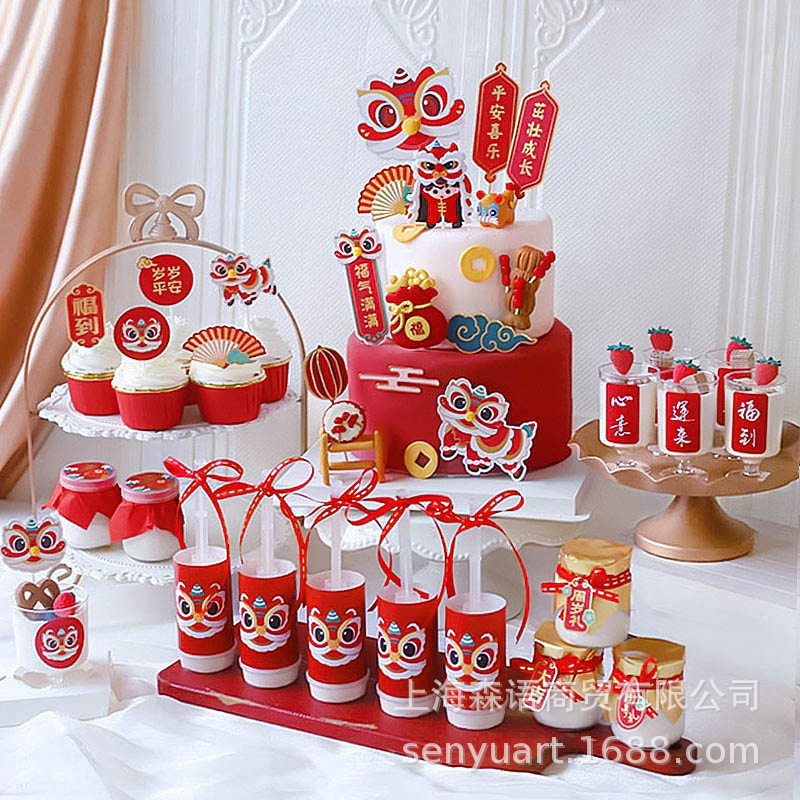 中国風ベビーの1歳の誕生日、満月ケーキのデコレーション、鯉の舞、獅子舞、飾り板、吊り下げ飾り、デザートテーブルの装飾