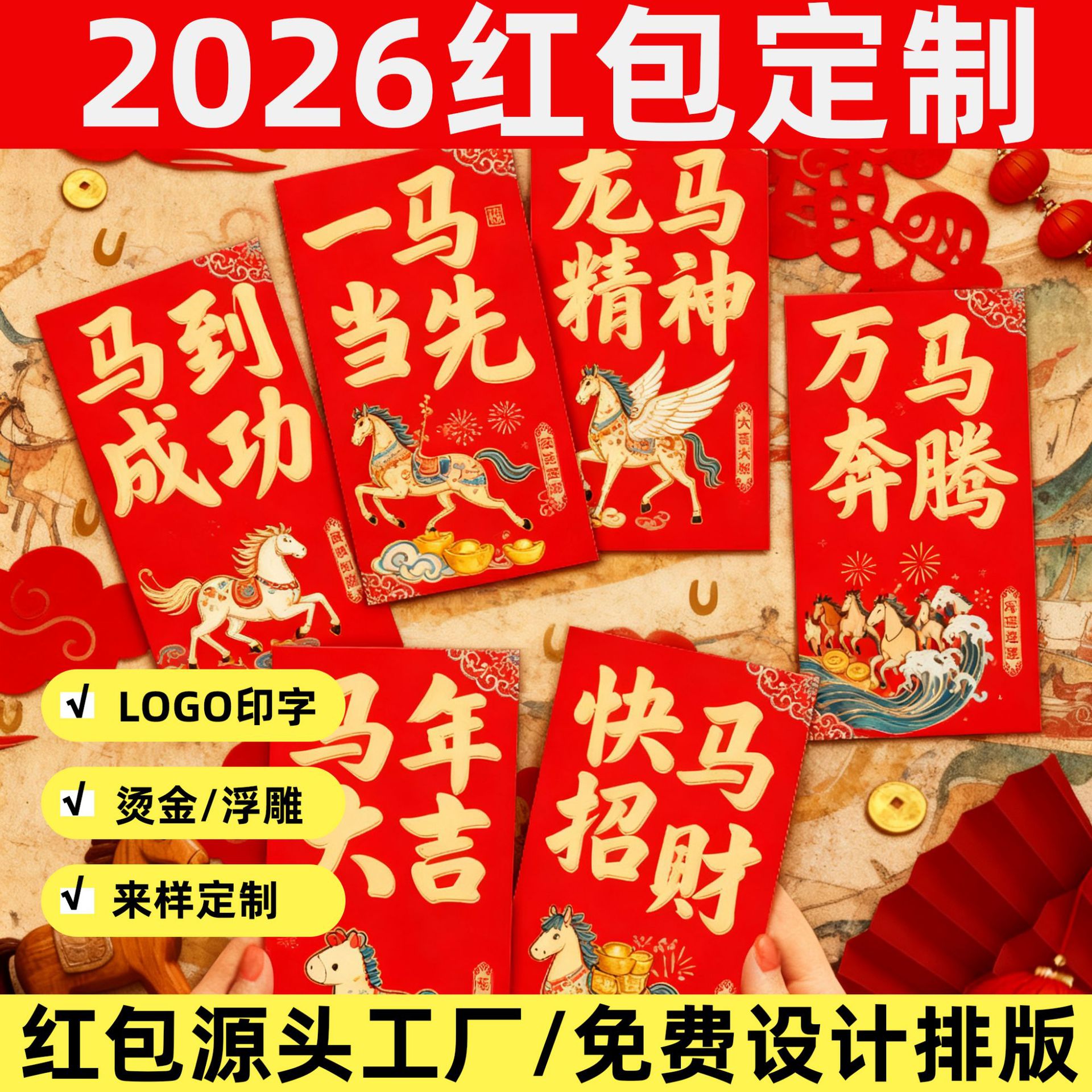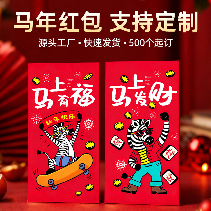2026年馬年紅包、カスタムリースーパック、新年福文字入り紅包、開店祝い袋、カスタムメイド、幸運のお守り、ロゴ印刷可能