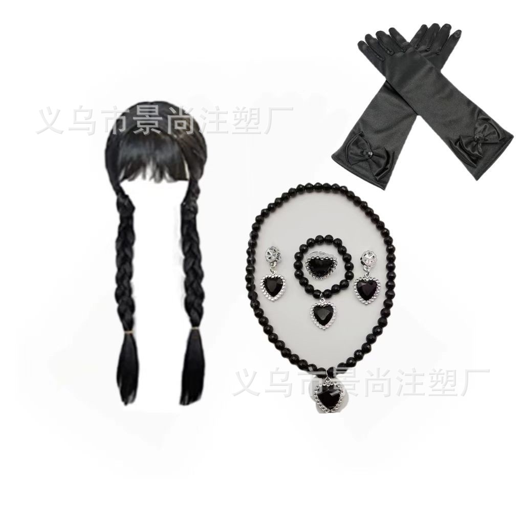 ハロウィン アダムス風前髪ウィッグ ネックレス ブレスレット イヤリング 指輪 手袋 アクセサリー 黒ウィッグ ミドルパート ブレイド