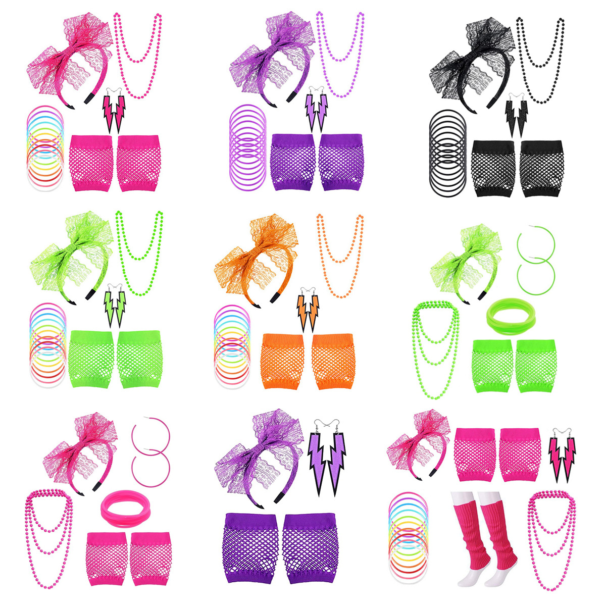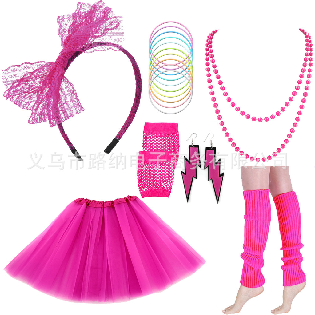 80sネオンのテーマのパーティーの舞踏会のアクセサリーのネックレスのリボンのレースのカチューシャの稲妻のイヤリングのガーゼのスカートのスーツ