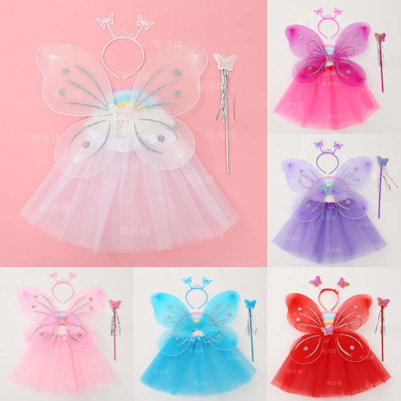 蝶の翼の4つのセットの子供の蓬蓬のスカートのセットの天使の翼のバックはアンドロメダの棒のカチューシャの現物の卸売りを飾ります。