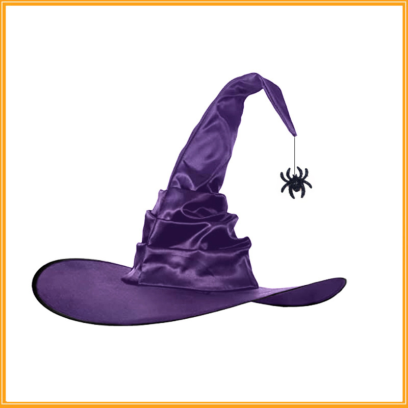 現物ハロウィーンのしわの呪術師の帽子のポリエステルの塔夫のクモのペンダントのハリー・ポッターの魔女の帽子の角の女性の魔女の帽子