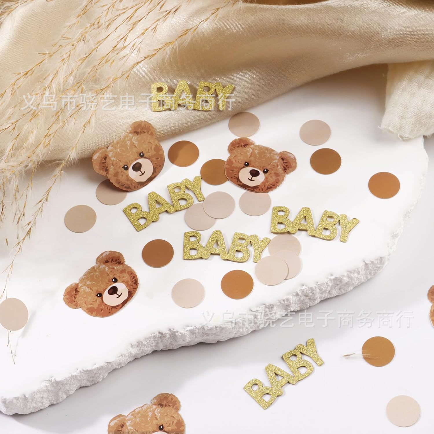 BABYかわいいベアーのデスクトップの色とりどりの紙くず100点がテディベアのテーブルに紙切れを撒いている