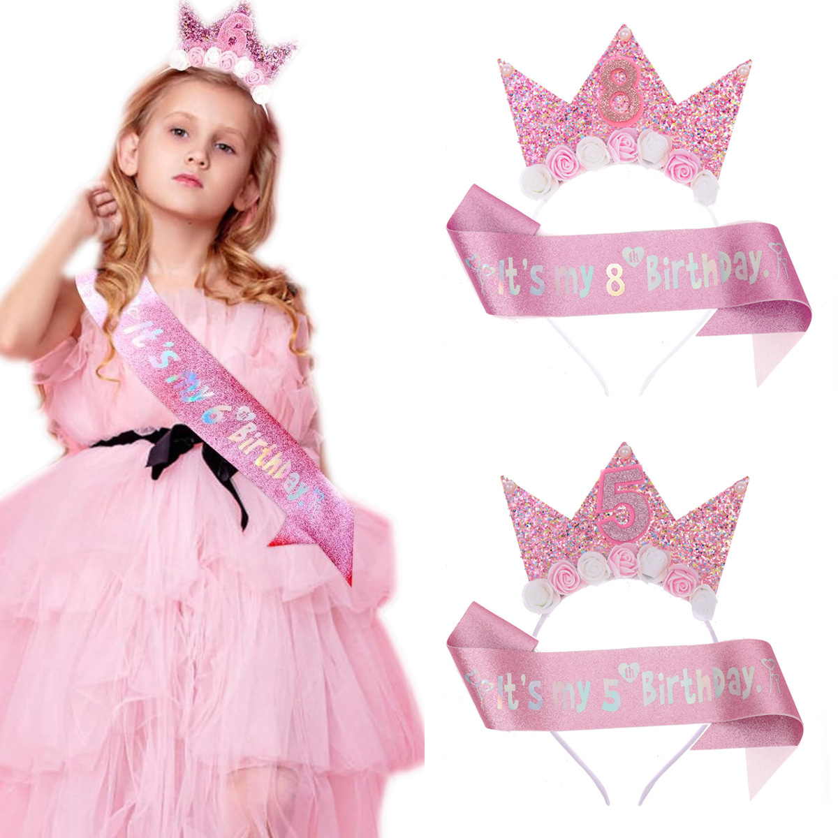 2歳3歳4歳5歳6歳7歳女の子クラウンピンクリボン子供诞生日カチューシャギフトリボンセット