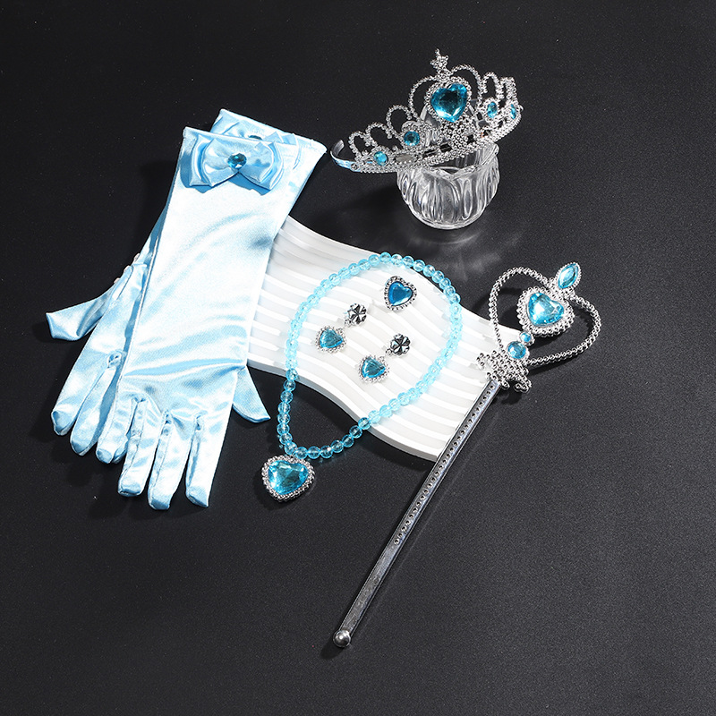 アナと雪の女王の愛莎の王女の服装はお下げの手袋のネックレスの王冠の魔法の棒の6つのセットを飾ります。