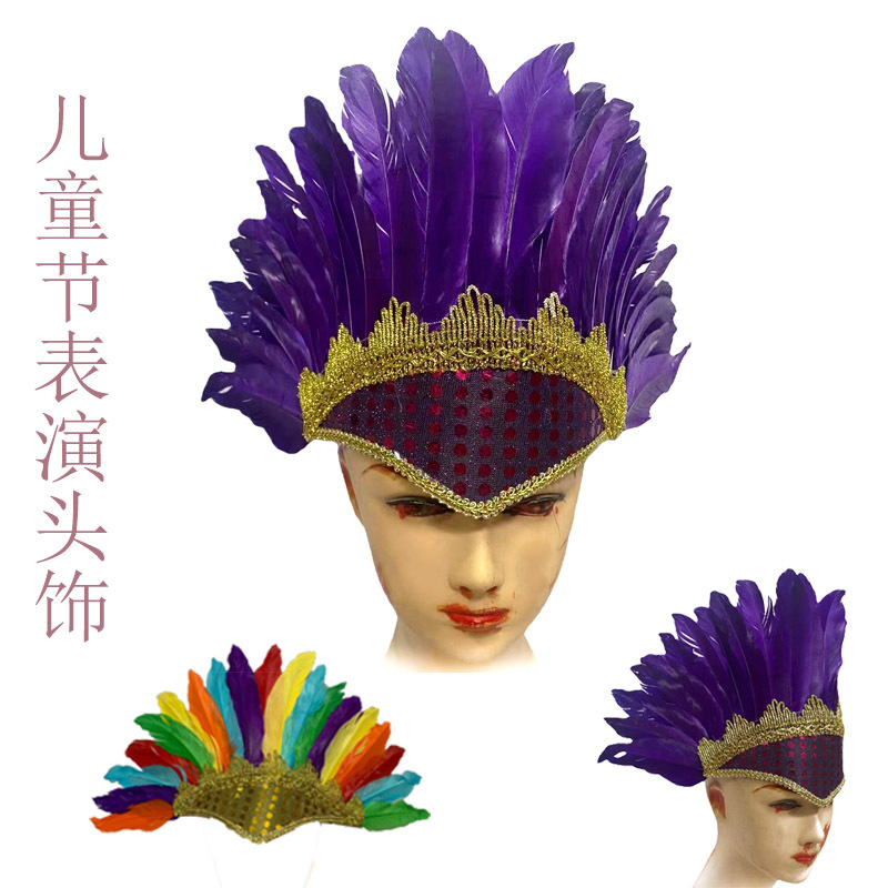 国境を越えたハロウィーン六一子供の日にパーティーの羽インディアン首長のカラー頭飾り道具を披露する