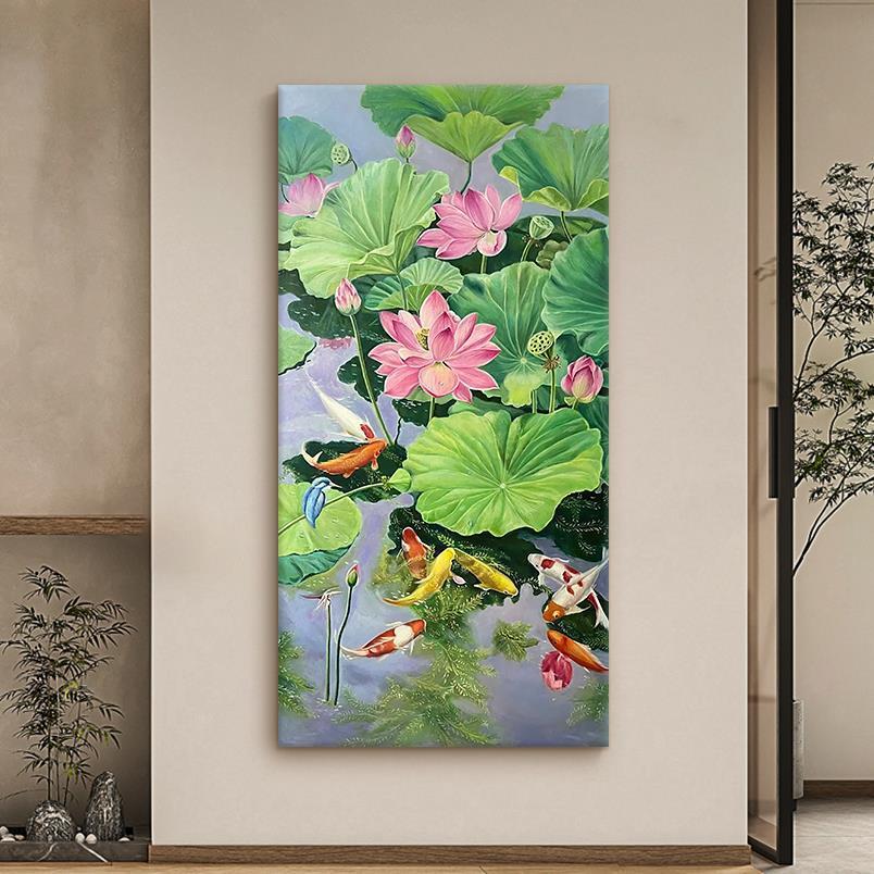 新しい中国風の手描きの魚の絵油絵玄関ホール装飾絵画鯉蓮垂直通路廊下吊り絵画
