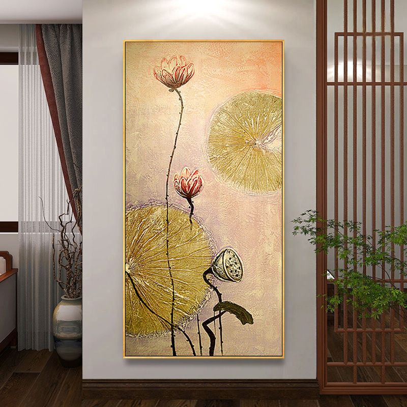 純粋な手描きの油絵新しい中国風の玄関装飾絵画垂直廊下通路吊り絵画東南アジアタイ壁画蓮