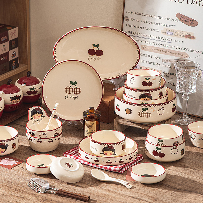 レトロなチェリーガール漫画のボウルと皿家庭用皿かわいいセラミック高価値食器誕生日親友ギフト