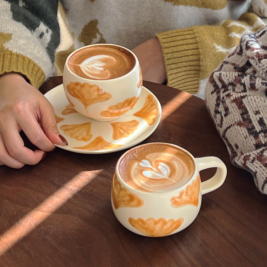 手描きのイチョウの葉のコーヒーカップの卵の形の形のコップの大口の花を引っ張るコップの家庭用陶磁器のコップのナッツの皿の果物の皿