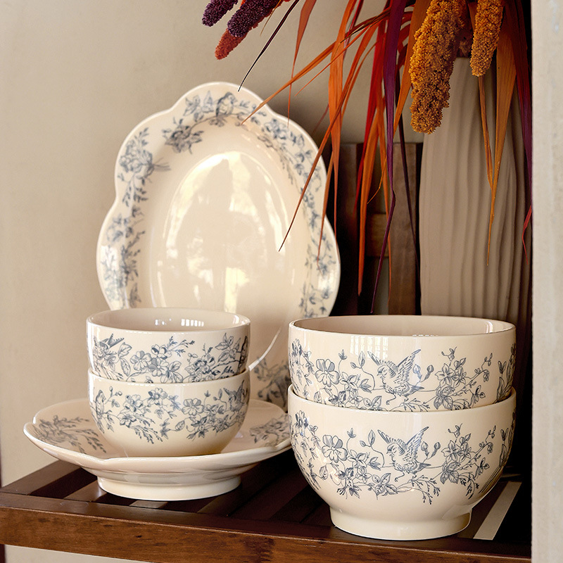 北欧レトロ陶磁器碗皿花卉釉薬下彩高颜値家庭用陶磁器食器新居移転プレゼント卸売り