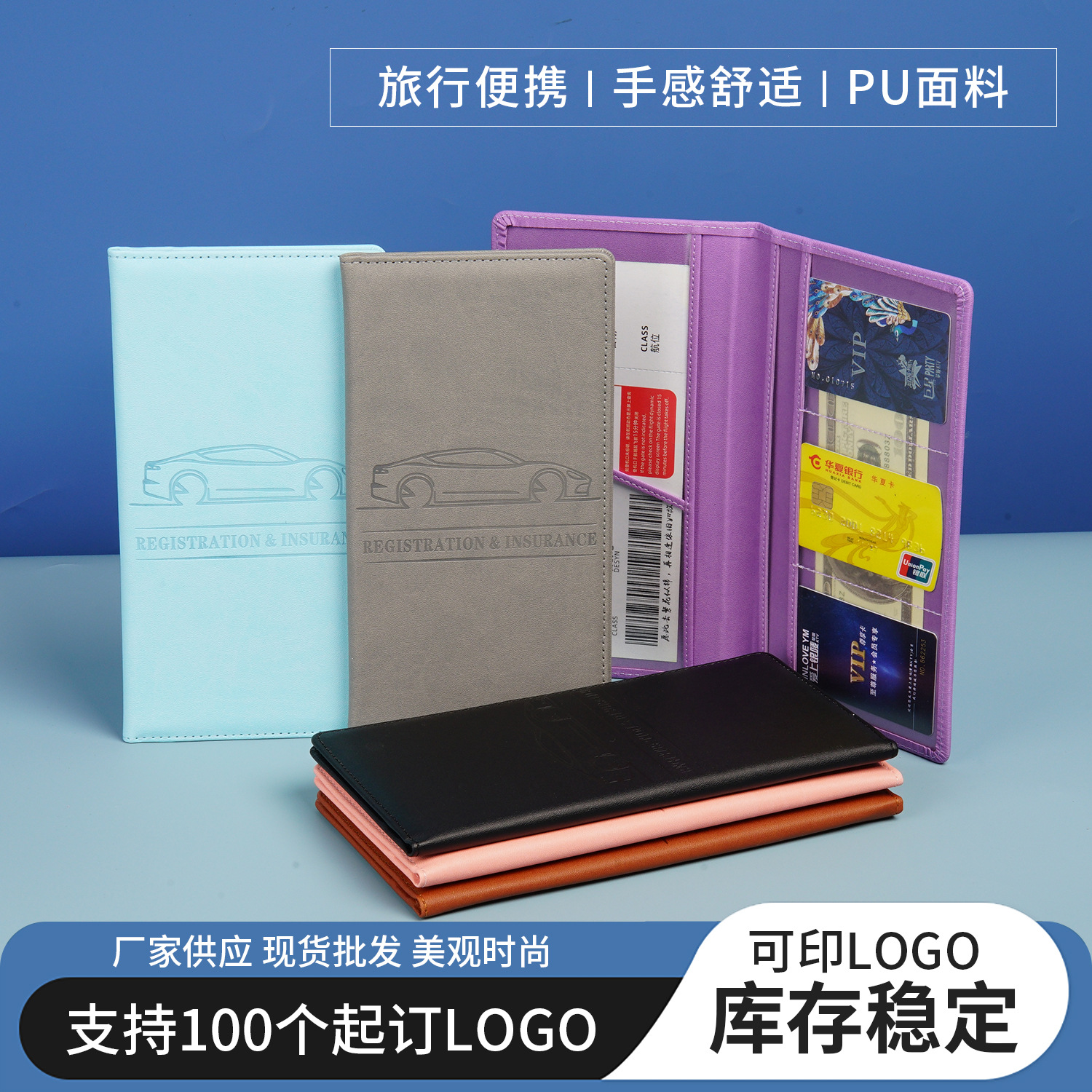国境を越えた書類セット、カスタマイズされた自動車登録証明書、運転免許証、保険情報収納バッグ、チケットホルダー、PU書類セット