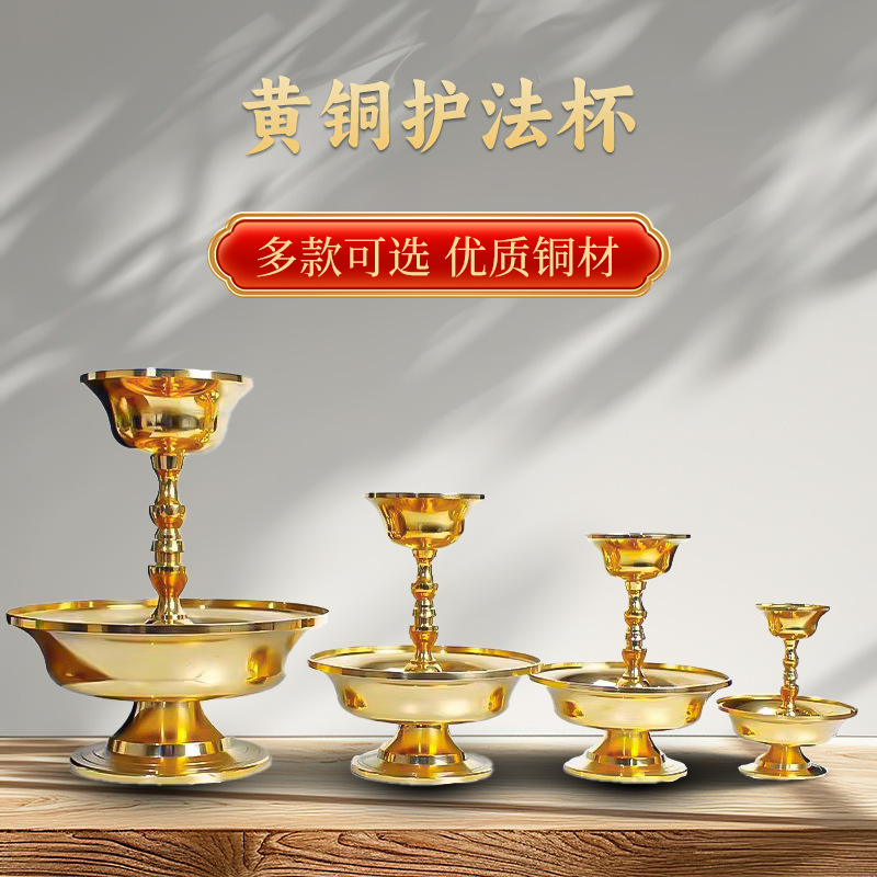 真鍮の護法杯の仏の前に杯の聖水杯を提供します。