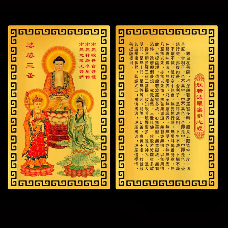 三聖金カード 心経全文 釈迦牟尼仏 弥勒観音菩薩 金属カード 平和と身を守るカード