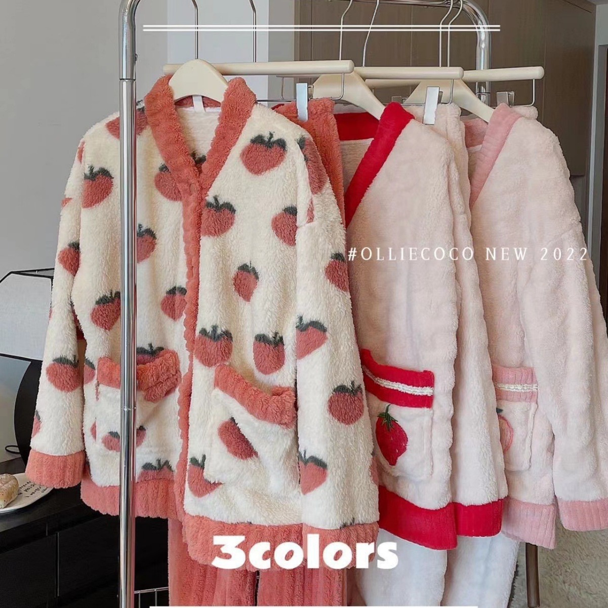 ピンク水蜜桃カーディガン烏龍桃長袖長ズボン小香風フランネル暖かいパジャマセットホームウェア