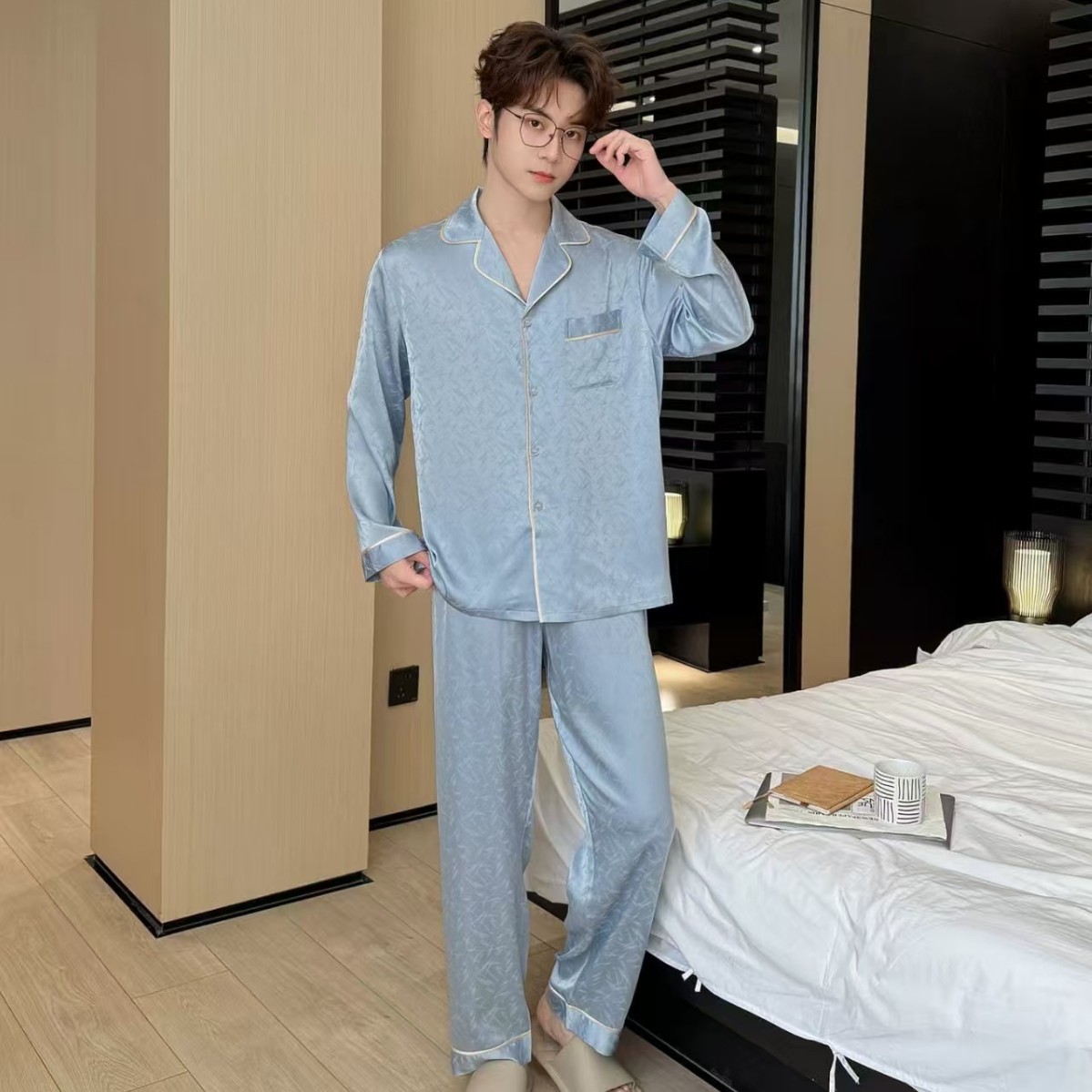 【メンズ軽豪華】シンプルジャカードアイスシルク高級感秋長袖ルームウェアセット