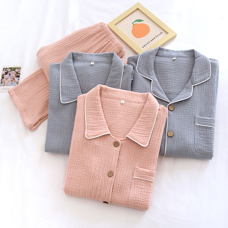 純綿新型カップル縮み布春夏ホームウェア男女二重ガーゼ快適ゆったりパジャマセット