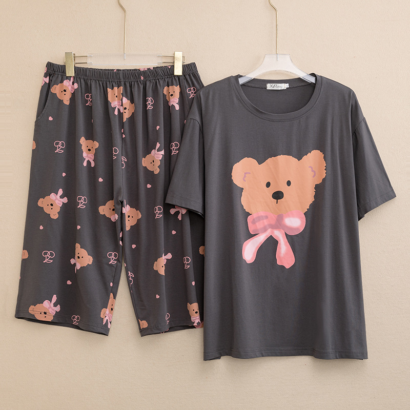 女性半袖五分ズボンパジャマ大サイズニット綿薄タイプ夏カジュアル200斤男性ホームウェアセット