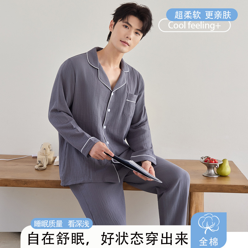 春と秋の薄いメンズパジャマセット二重泡綿糸カジュアルホームウェア長袖長ズボン源工場