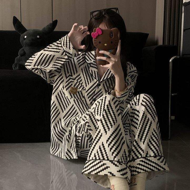 2025 新しい純綿カップルパジャマ女性の春と夏の長袖メンズホームウェアセットは屋外で着用できます