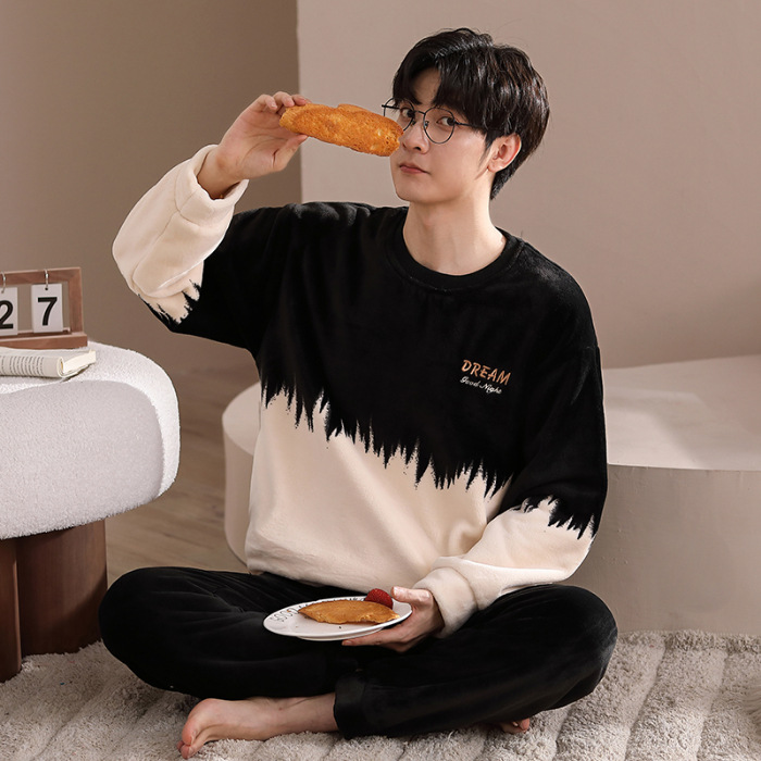 サンゴの毛の男性のパジャマの秋冬の恒温の厚い丸首の簡単なフランネルの2024の新型の家庭服のスーツ
