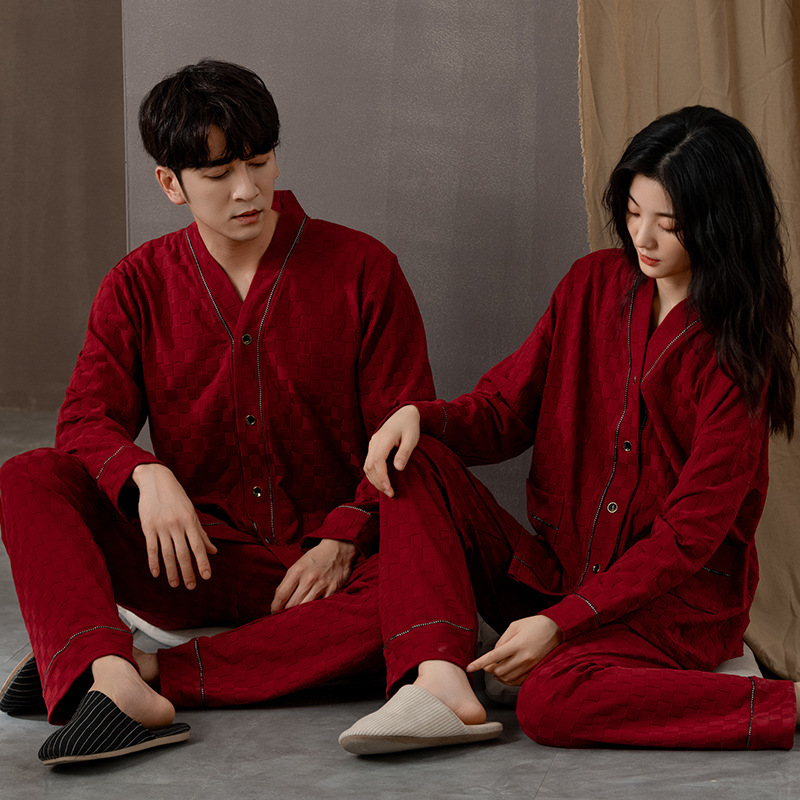 大紅のお祝いの綿のカップルのカーディガンの高級パジャマセット春と秋の男性の結婚式の純綿の女性の秋の家庭服