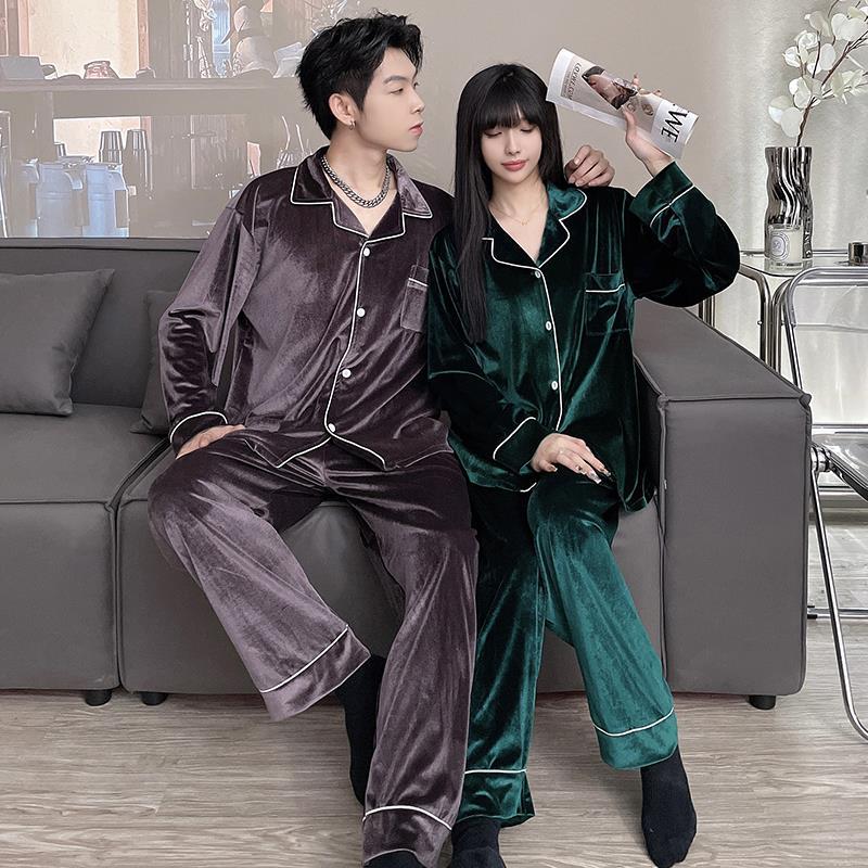 秋冬にベルベットを厚くしたフランネルの軽熟風女性家服青果襟長袖パジャマセット男性外着