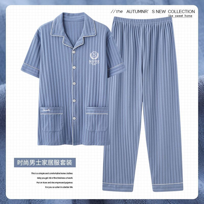 男性パジャマ100% 純綿夏半袖長ズボン男性薄い春と秋の大きいサイズの家庭服3点セット