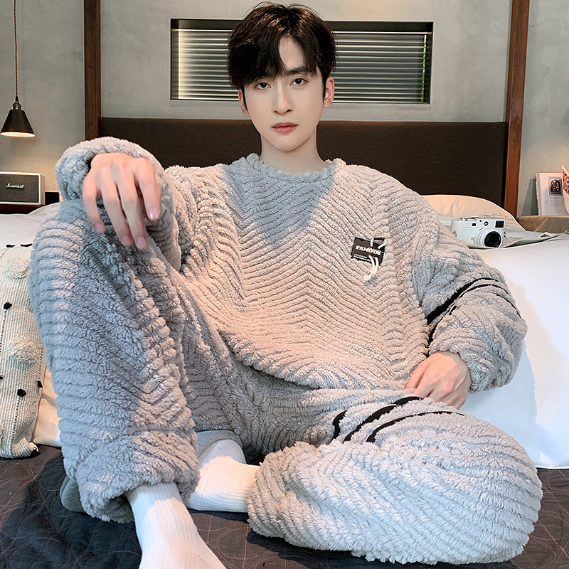 実店舗 長毛織りジャカード メンズパジャマ 長袖 冬新作 フランネル 厚手 保温 ホームウェア 上下セット