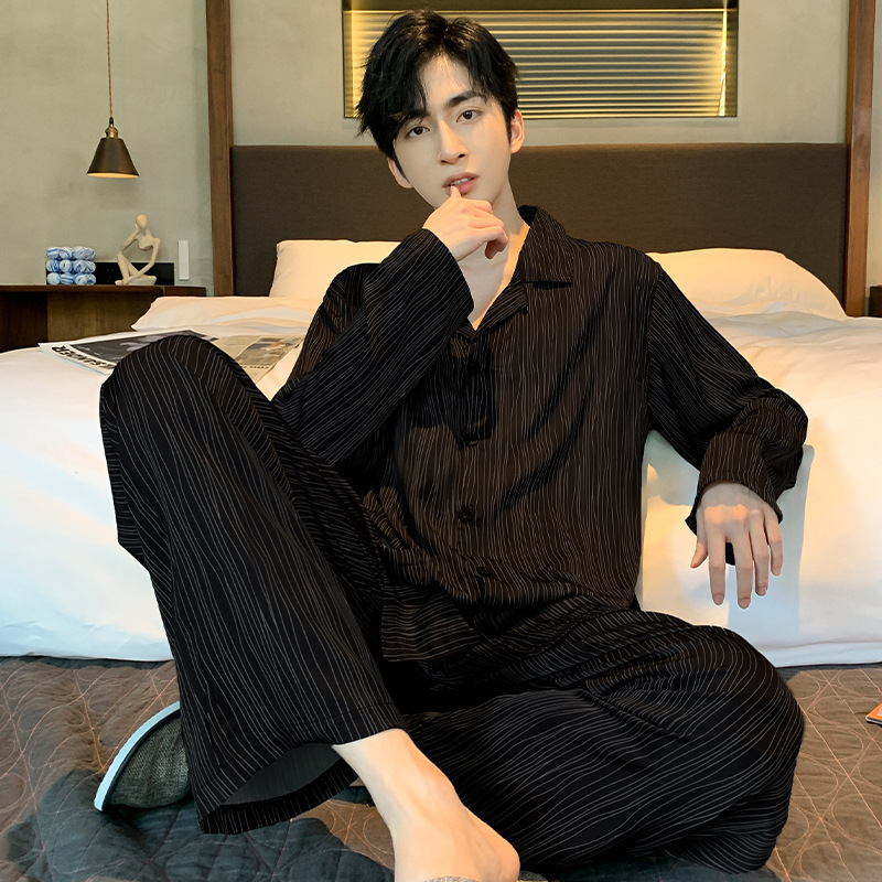 A類男性パジャマ純綿長袖長ズボンセット高級感細い縞ゆるいパジャマ男性家庭服セット