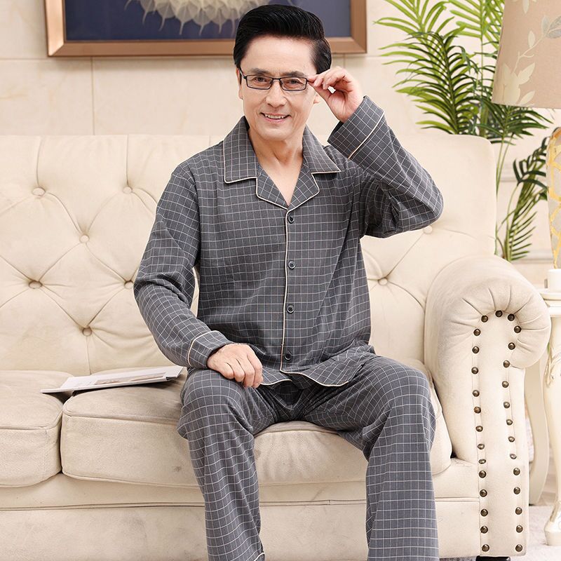 中高年春秋夏綿質薄手男性長袖パジャマゆったりカジュアル大サイズ父父ホームウェア