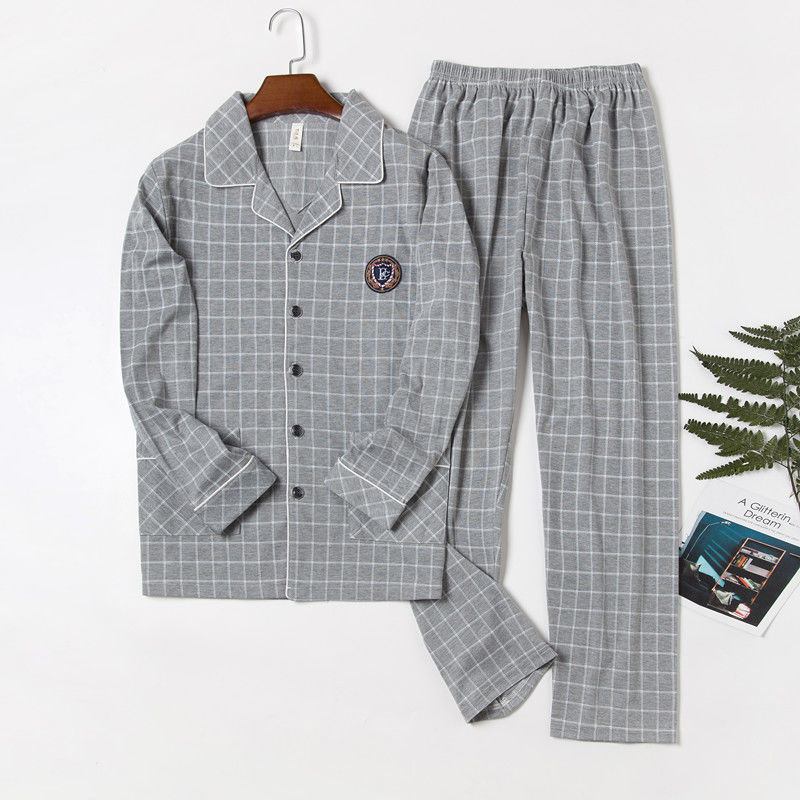新型パジャマ男性春秋100% 純綿長袖格子秋冬に肥料を加えて全綿家庭服セット