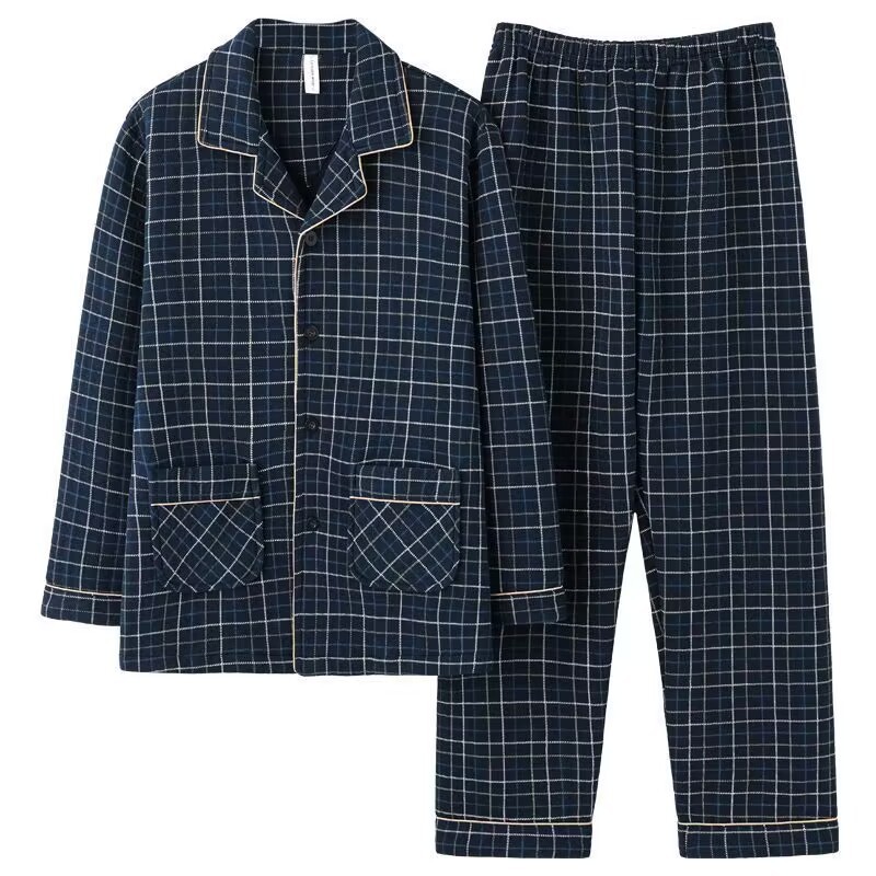 100% 純綿パジャマ男性春秋長袖秋冬スタイル青年男性用格子家庭服セット