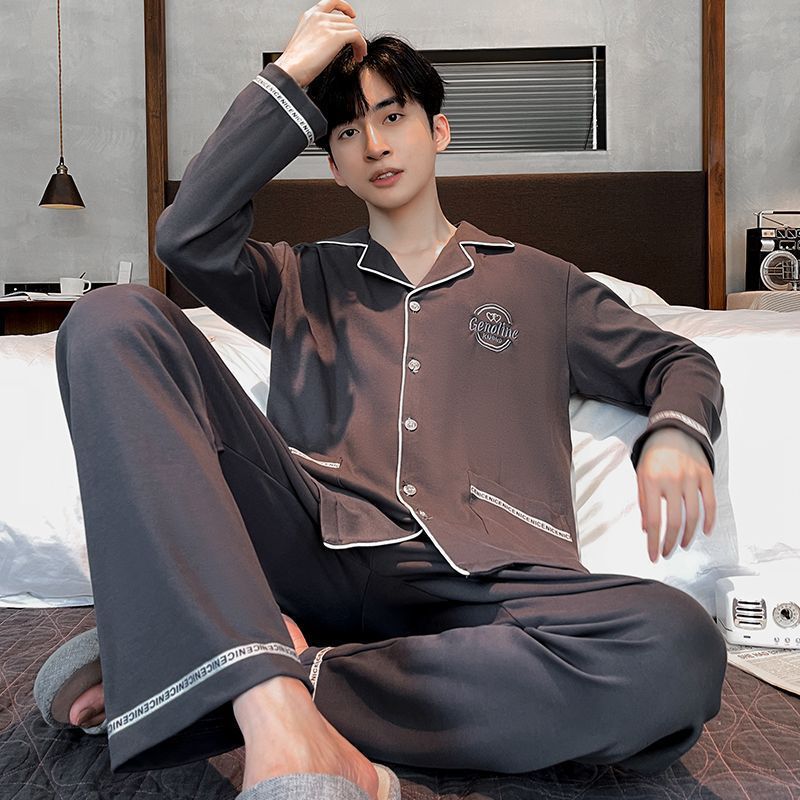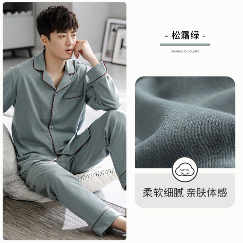 100% 純綿パジャマ男性春秋長袖カーディガン大サイズ中青年家庭服男性式秋冬服セット