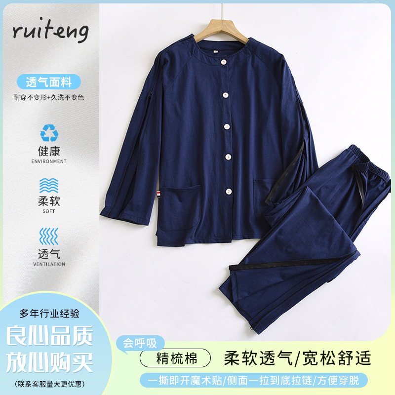寝たきり麻痺高齢者用の着脱が簡単な男性用薄手綿春秋鍼治療透析化学療法骨折ケア服