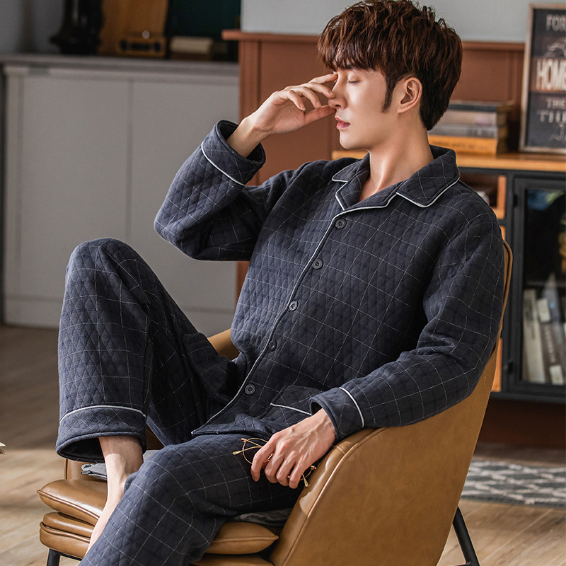 パジャマ男性春秋冬タイプの厚手カーディガン長袖ホームウェア冬の薄手タイプの綿入り薄い綿入りサンドイッチセット