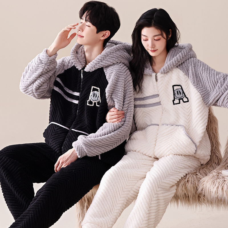冬の女性のパジャマは、複合ベルベットの二重保温家庭服男性フランネルのカジュアルスーツのカーディガンを厚くした