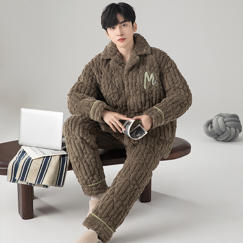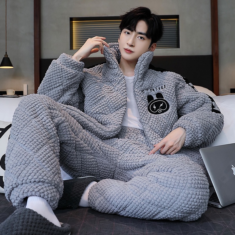 実体店パジャマ男性冬コーラルベルベット綿三階厚保温ロングジッパー立襟ホームセット