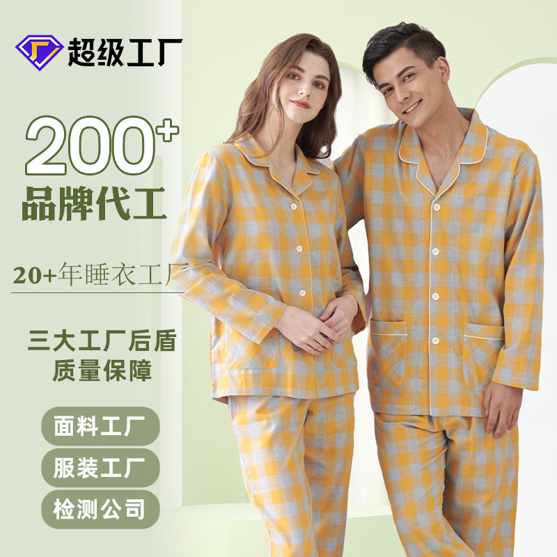 新商品二重ヤーン純綿カップルパジャマ女性春秋日系シンプル純綿男性パジャマホームウェアセット