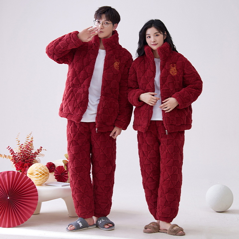 Qおめでたいジッパーカップル三層綿を挟んで新しい男性パジャマ女性ジャカードカップルパジャマ冬の外着