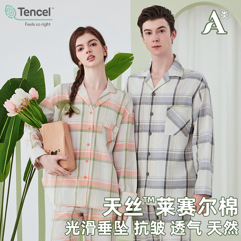 日系格子カップルパジャマ女性春秋綿綿綿布薄い夏男性秋冬長袖ホームウェアセット