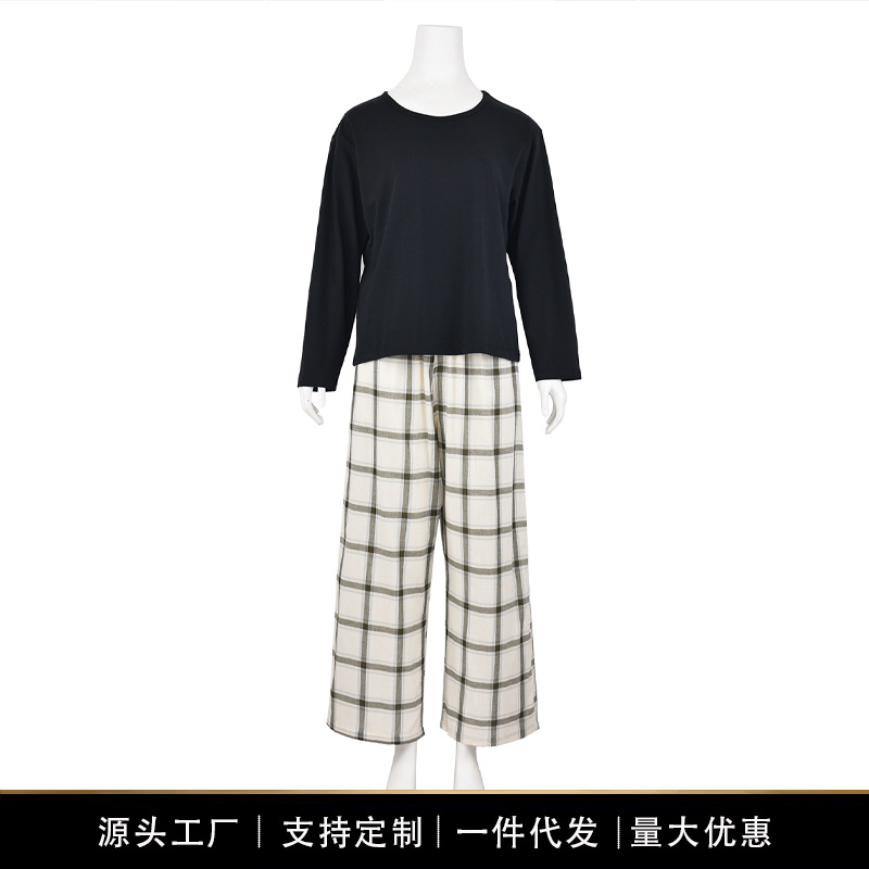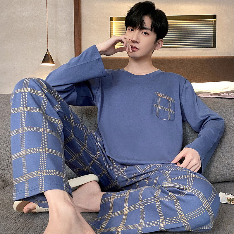 100% 純綿パジャマ男性春秋長袖秋冬スタイル青年男性用格子家庭服セット