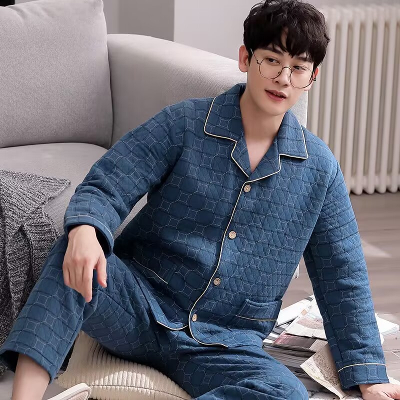 メンズパジャマ秋冬純綿厚手薄いコットン入り綿入り合わせ合わせセット空気綿中厚手ホームウェア春秋