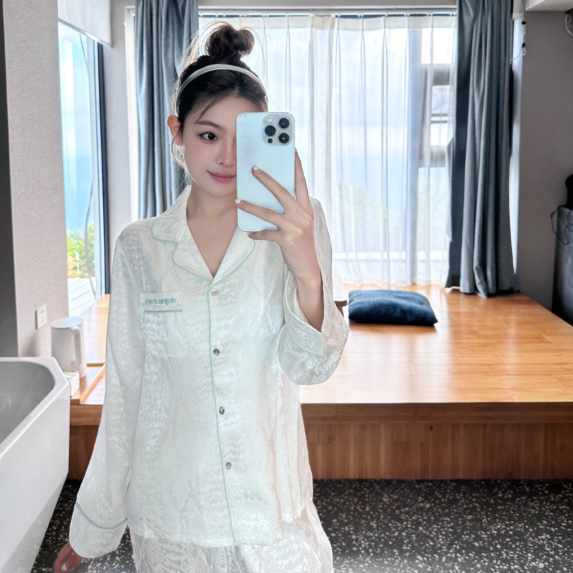 2023年新作極光白サテンレディースパジャマ長袖長ズボン男家服カップル春秋代発
